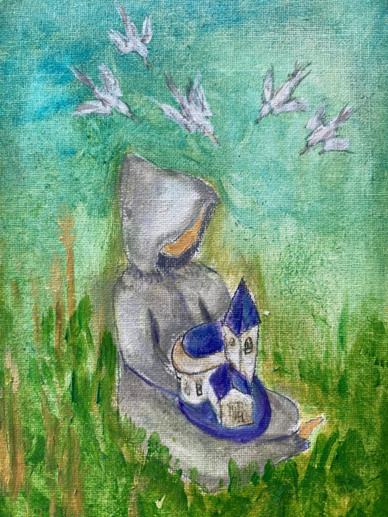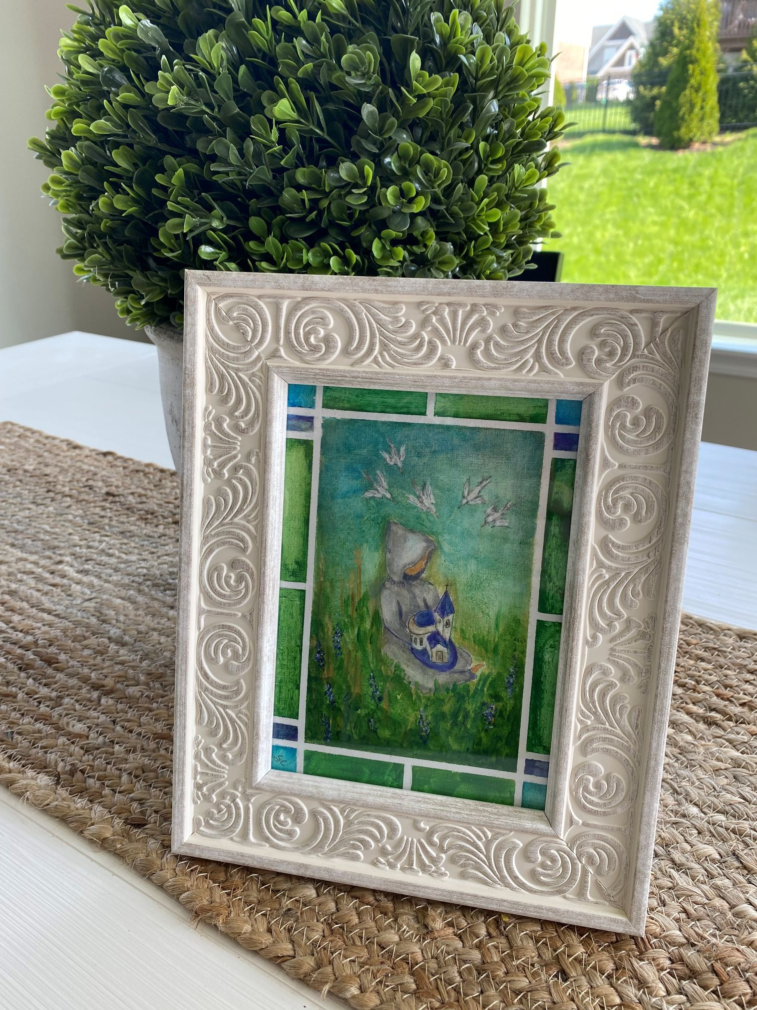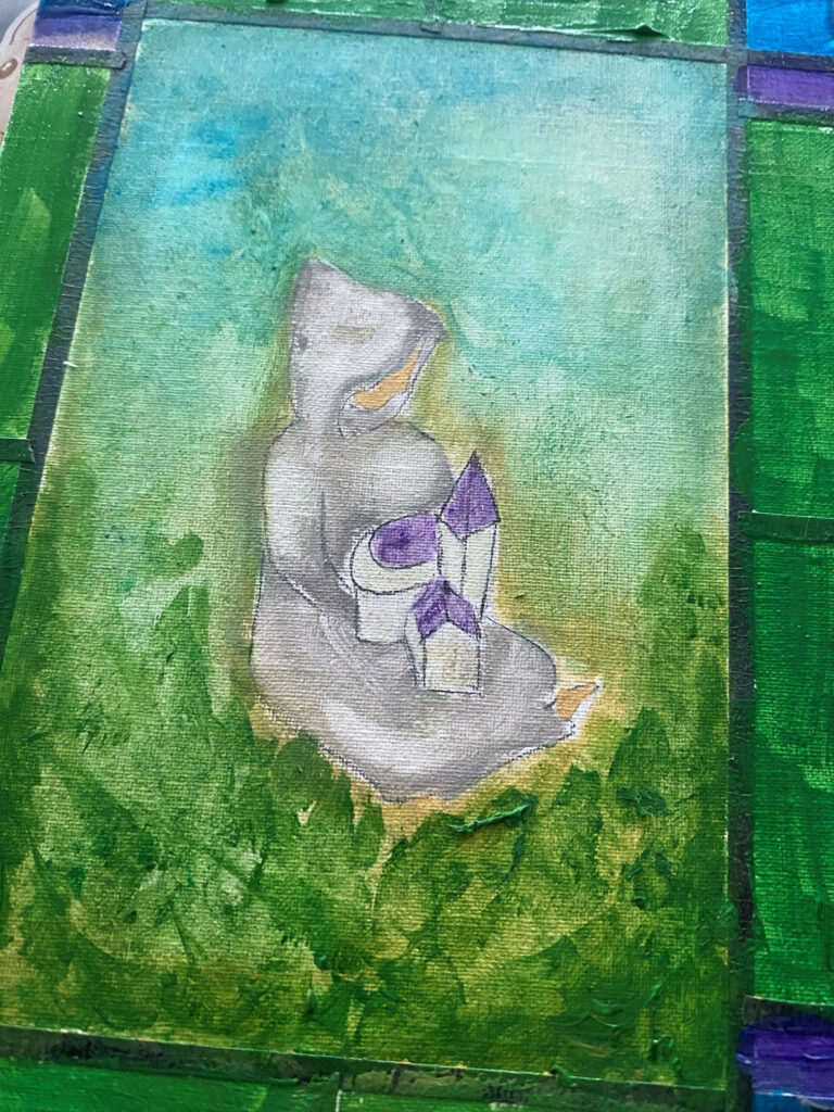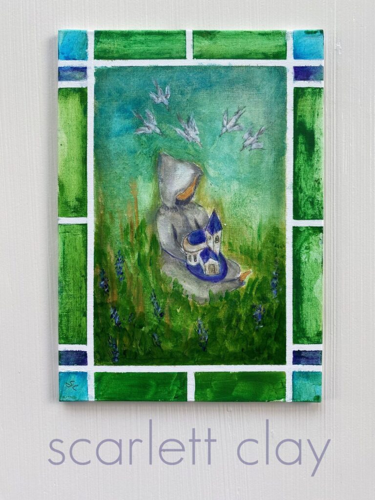 The result is this 5″x7″ acrylic painting titled, “Hope for the Abbey.” I took inspiration from medieval paintings where saints or clergy are holding miniature models of churches to symbolize their devotion. In this painting, a Trappist holds a miniature model of the Abbey. This symbolizes the way Fr. Kelley and other Trappists at Gethsemani hold the Abbey in prayer, hopeful and expectant. Hope is also represented by the bright greens in the paintings and the birds, which recall the joyful birdsong and verdant transformation of the Abbey grounds in springtime.